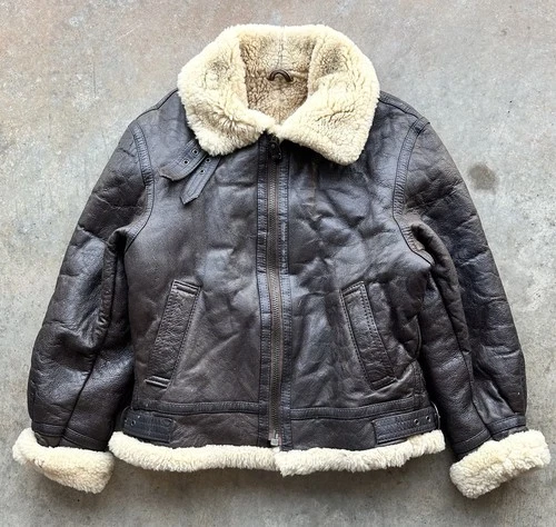 Vintage B-3 Style Shearling Leather Flight Jacket Brown Aviator Bomber USAF Med