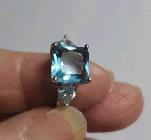 Stunning Ring Sz 8 Crystal Baby Blue Color Clear Heart Shaped Accents Silver