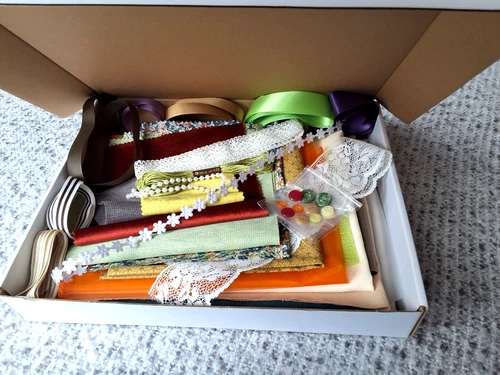 Fabric Inspiration Kit, Gift Box, Buttons, Ribbon, Thread, Lace, Material Sewing