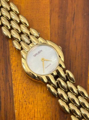 Vintage Gruen Watch Women Gold Tone Beads Of Rice Quartz 24mm New Battery