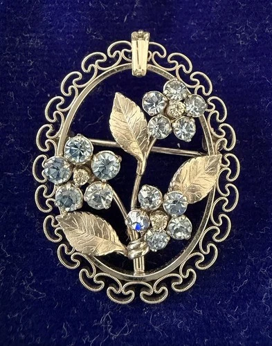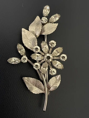 Vtg Krementz 14k White Gold Plated Clear Stone Flower Brooch Signed