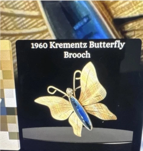 Vintage Krementz Butterfly Brooch Gold Tone Blue Enamel Rhinestone 1960s