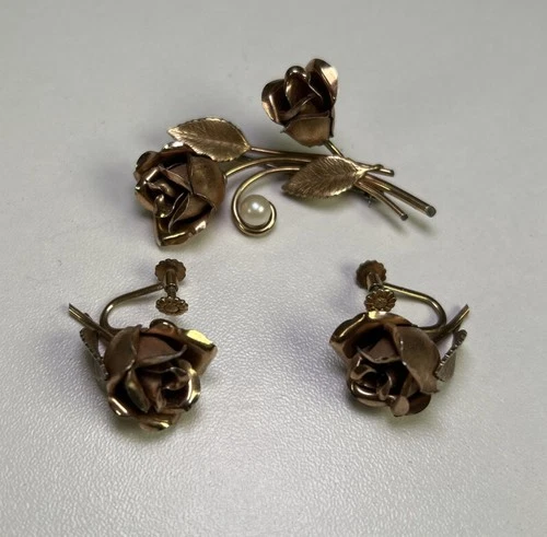 VTG Krementz Rose Brooch Pin & Screwback Earrings Set MCM 14K Gold Overlay