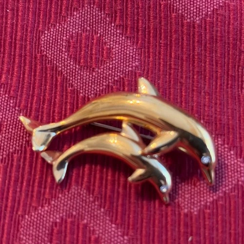 Vintage KREMENTZ Two Dolphins Mother & Baby Gold Tone Crystal Eyes Pin