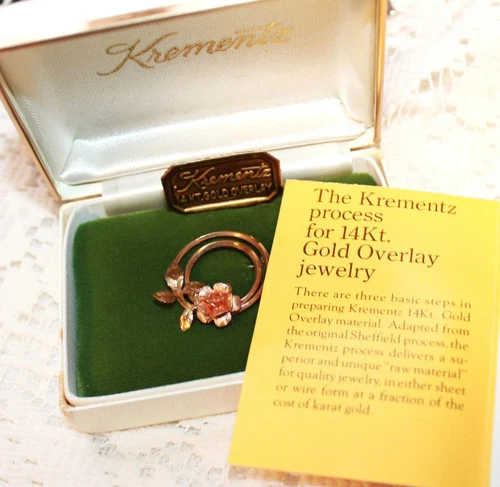 Vintage Krementz Rose 14 Kt Gold Overlay Brooch in original box with Papers
