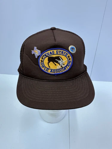 Vtg Texas State Rifle Association Cap Brown Trucker Hat Mesh With PINS