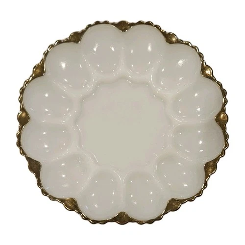 VINTAGE ANCHOR HOCKING Deviled Egg Tray Milk Glass Gold Rim FIRE KING 9.75"D