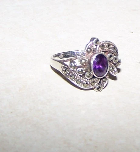 Amethyst Gemstone Marcasite 925 Sterling Silver Signed TH Ring Sz 7.5 Beautiful
