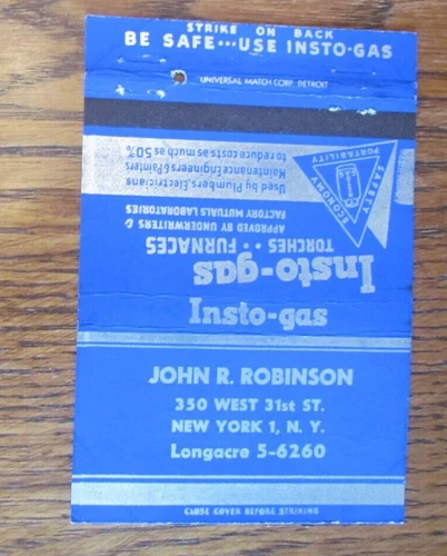 ROYAL FLASH MATCHBOOK COVER: JOHN ROBINSON INSTO-GAS NEW YORK CITY MATCHCOVER -B