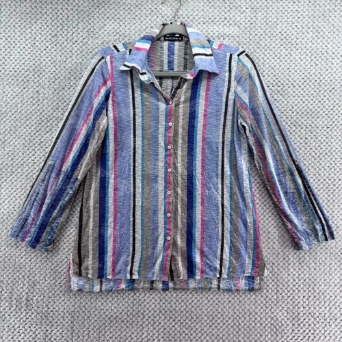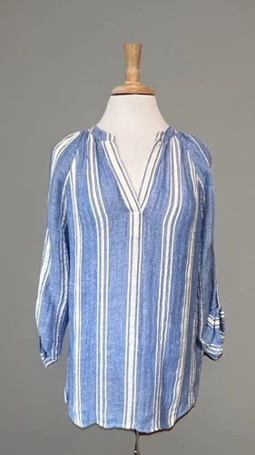 Soft Surroundings Women's M Blue White Linen Resort Tunic Top Roll Tab Sleeve