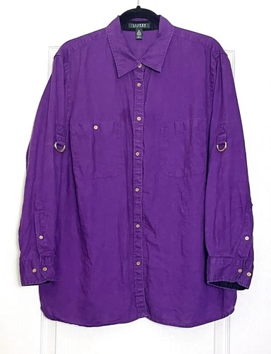 Lauren Ralph Lauren Purple 100% Linen Button-Up Top Size 2X Roll Tab Sleeves