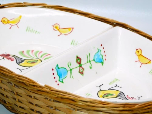 Rooster Vintage Dish Snack Set Divided Oval Basket Chicks Hand Painted Japan