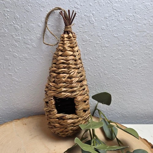 Rustic Woven Straw Bird House Hanging Nesting Pocket Natural Seagrass Decor