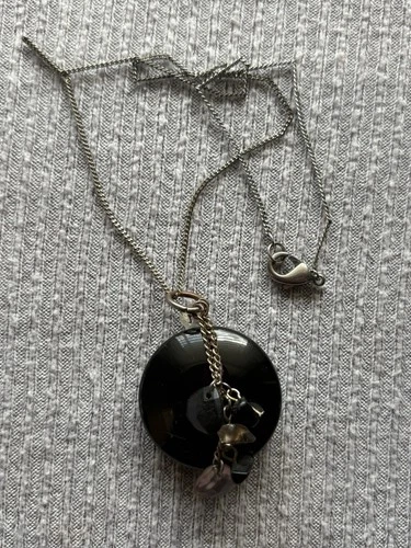 Vintage silver tone necklace w round black onyx pendant w dangly gems over it