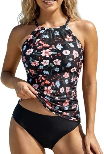Tempt Me Women's Tankini Swimsuit Two Piece High Neck Ruched with Bottom SMALL