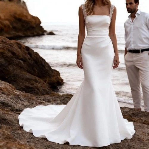 Mermaid Simple Pearls Wedding Dress Sleeveless Spaghetti Strap Satin Bride Gown