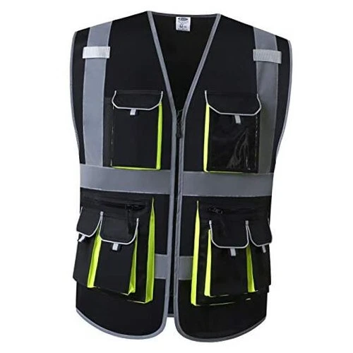 10 Pockets High Visibility Zipper Front Safety Vest with High Medium Black
