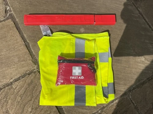 Large Warning Car Triangle, safety vest & first aid kit