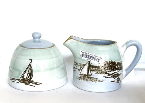 Coastal Sketchbook Ceramic Creamer & Sugar Set By Blue Sky Spectrum Sailboat