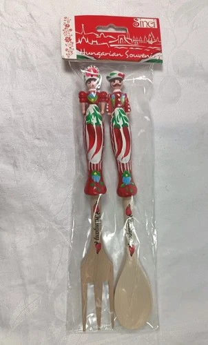 Vintage Budapest Hungary Hand Painted Wooden Salad Servers Spoon Fork Set