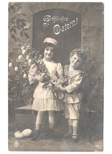 1908 photo postcard Happy Easter girl with hat eggs willow flowers