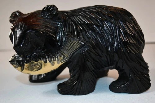 VTG Japanese Wooden Hand Carved Ainu Bear with Salmon in Mouth, Kibori Kuma,