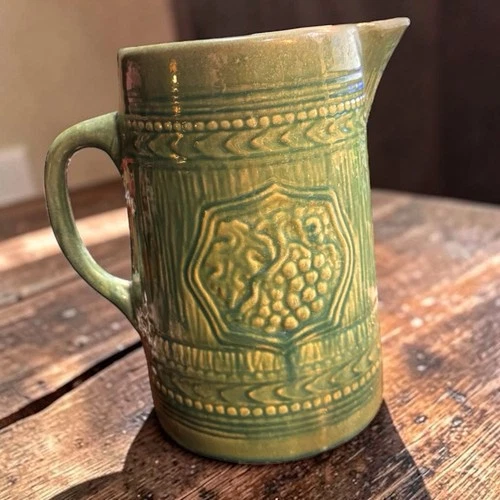 Antique McCoy Green Salt Glazed Stoneware Pitcher Grape Bark Design 8.5