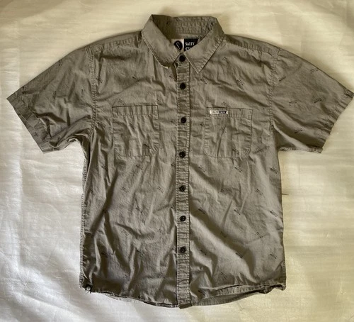 Salty Crew Gray Button-Up Shirt Men's Large Fishing Hook Design Casual Top Pock