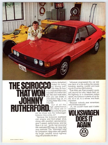1980 JOHNNY RUTHERFORD VOLKSWAGEN SCIROCCO Vintage 8"X11" Magazine Ad 80's HCF17
