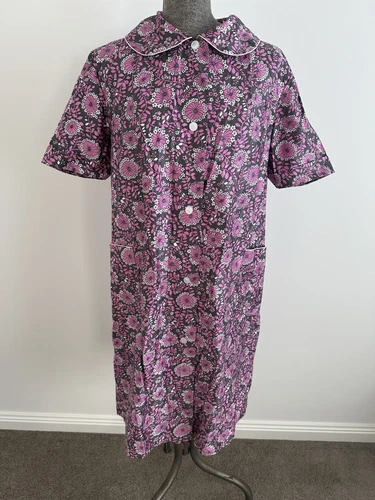 Vintage 60s Rose Cotton Screen Print Floral Pink Grey Shirt House Dress 16 XL