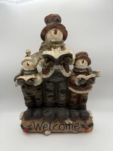 Resin Snowman Carolers Family Welcome Figurine Christmas Holiday Wood Look