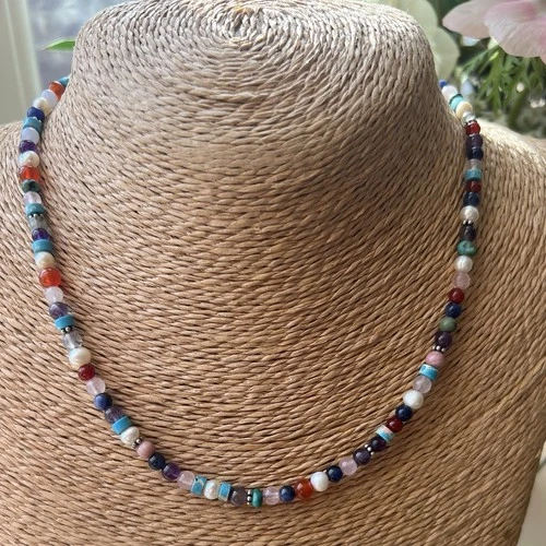 Multi Semi Precious Gem Stone Necklace Handmade Sterling Silver Fittings 16inch
