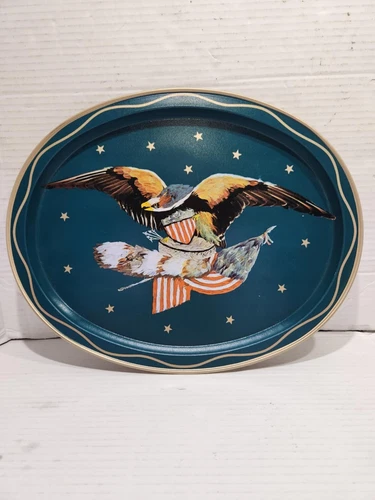 Vtg. Green, Patriotic American Bald Eagle Metal Serving Tray 14.5 X 11.5 X 1