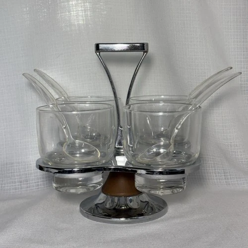 Vintage MCM 4-Cup Glass Condiment Serving Set with Chrome Holder