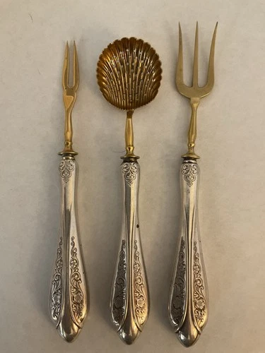 Antique Silver Plated / Gold Wash 3 pc Set-Sugar Spoon, Serving Fork,Pickle Fork
