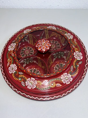 Painted Enamel Red Thali Lidded Snack Serving 6 Piece Set Festive Holiday Party