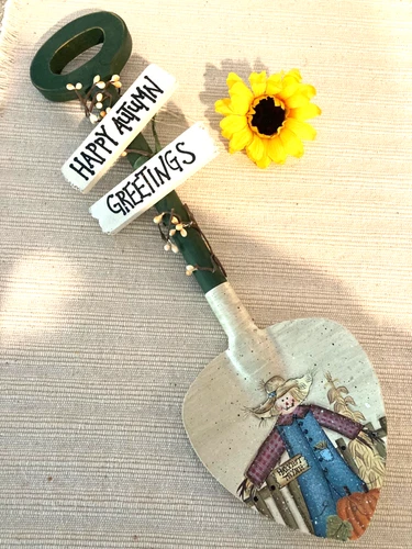 Happy Autumn Greetings Welcome Fall Door Decor Sign Shovel Scarecrow Pumpkin 16”