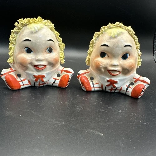 Vintage Humpty Dumpty Ceramic Spaghetti Hair salt pepper shaker w/ Japan Sticker