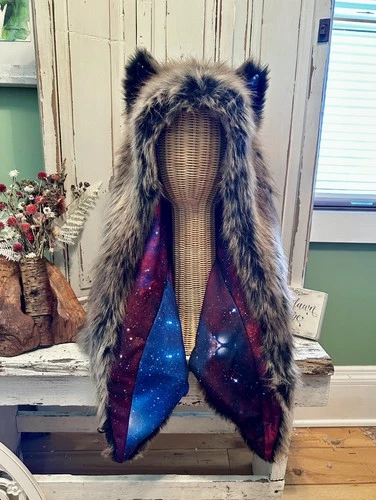Spirithoods LE Grey Wolf Galaxy Shawl RARE Faux Fur Cosmic Stars Moon Rave Emo
