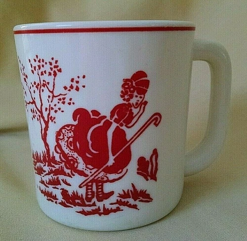 LITTLE BO PEEP MUG WHITE OPAQUE MILK GLASS RED STRIPE SHEEP GRAPHIC UNMARKED.