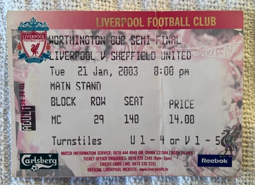Liverpool v Sheffield United 2003 League Cup Worthington Ticket Semi Final
