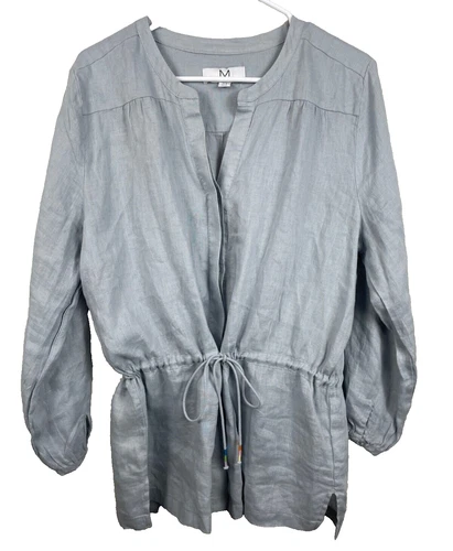 Magaschoni 100% Linen Tunic Top Large Blue Long Sleeve Button Down Shirt Blouse