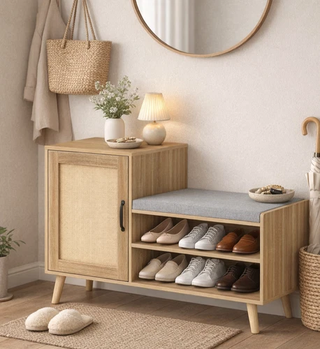 Shoe Cabinet Bench Adjustable Shelves Storage Cushion Rattan Entryway Natural