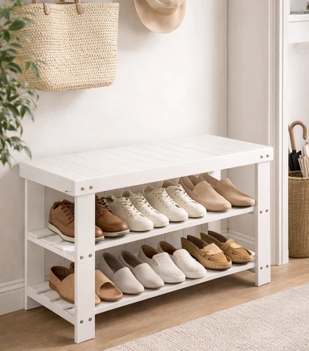 Shoe Bench 3 Tier Bamboo Rack Storage Seat Entryway Shelf White Wooden Unit