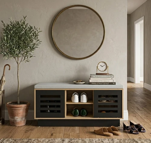 Shoe Bench 6 Compartment Storage Seat Cushion Sliding Door Entryway Wood Natural