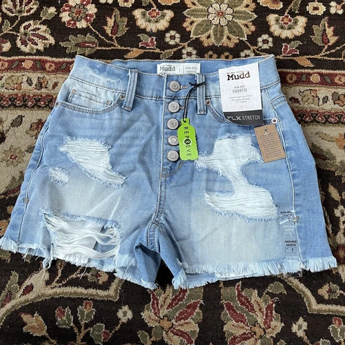 MUDD NWT Denim Shorts Button Fly Stretch High Rise Shortie Distressed Women’s 1