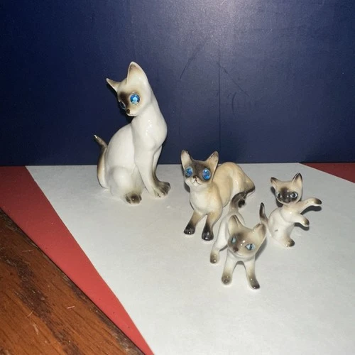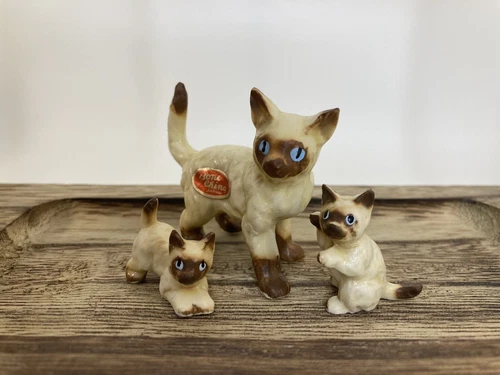 Siamese Cat Figurines Bone China Porcelain Set of 3 Cats Kittens Blue Eyes