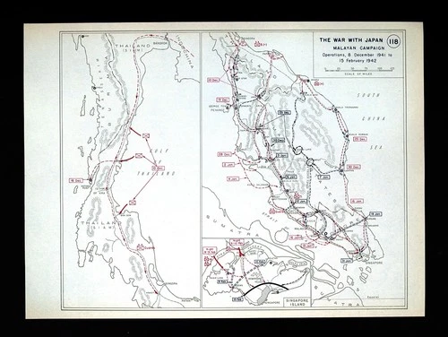 WWII Map 118 Japan Malaysia Campaign Battles Jitra Kampar Muar Gema Singapore UK