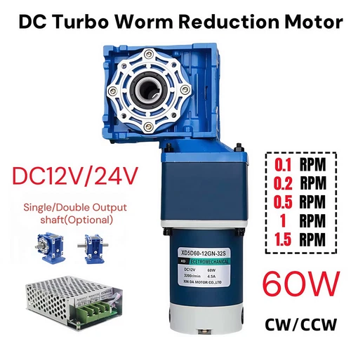 60W Two Stage Worm Gear Reducer Gearbox Motor Gearmotors 0.1 to 1.5RPM DC12V/24V