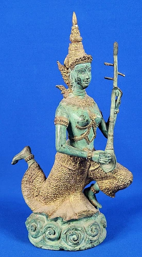 Vintage Thai Hindu Gilt Bronze Statue Namasakra Mudra Playing Sitar 11.75" Tall
